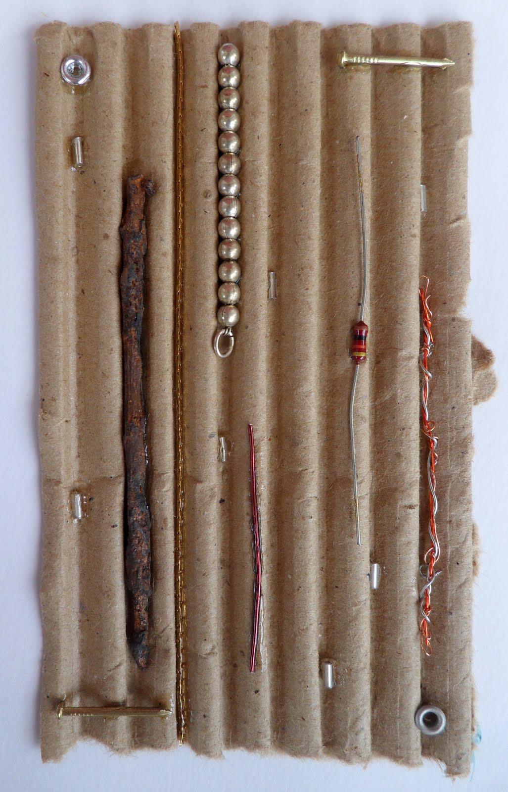 silk napkins, handmade papers, seed beads, brads, wire, found metal objects